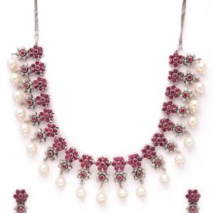 Oxidised Silver Plated Embellished With Faux Ruby Floral Necklace Set – Pink