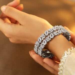 Set of 2 Rhodium-Plated Cubic Zirconia Studded Floral Pattern Premium Bangles – 02-Aug