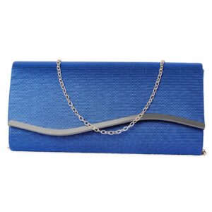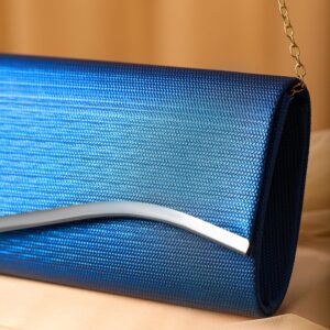 Blue Sapphire Glossy Textured Clutch with Silver-Tone Wavy Accent & Chain – Blue
