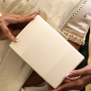 24K Gold Shimmery Glossy Box Clutch with Luxe Textured Finish & Chain – Cream