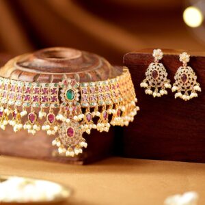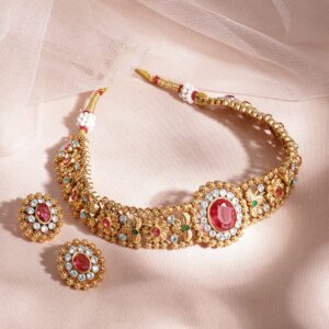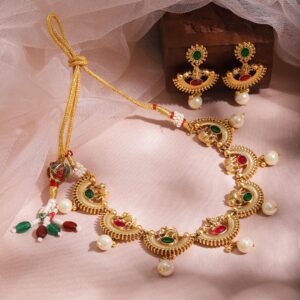 24K Gold Plated Ruby, Emerald & White Cubic Zirconia Stone Studded Handcrafted Floral Choker Jewelry Set – Green