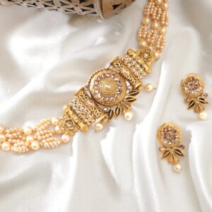 Gold Plated Kundan Choker Set With White And Mint Green Beads – Gold