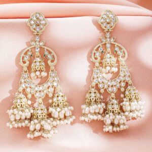 18K Gold-Plated White Kundan Studded Jhumka Earrings with Pearl Bead Drops