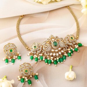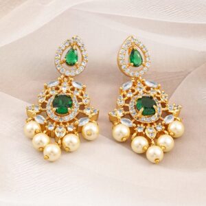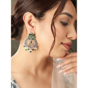 Oxidized Silver Emerald green stone studded pearl beaded statement earrings – Silver