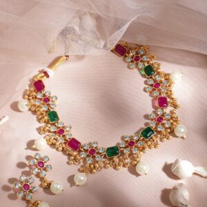 22K Gold Plated Brass Red And Green Stone Studded Pearls Hanging Jewellery Set – Multicolor