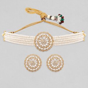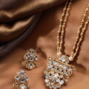 18K Gold-Plated Pearl Beaded Necklace with Kundan Pendant and Golden Drop Detailing