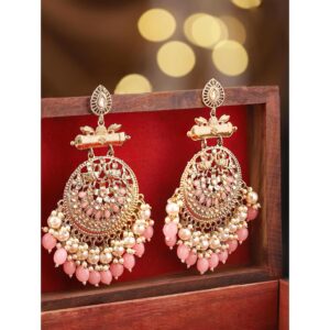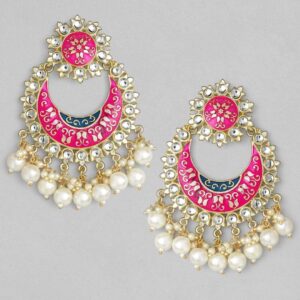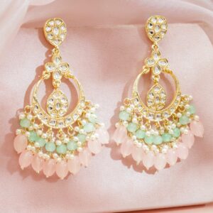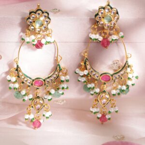 22K Gold-Plated Pachi Kundan Chandbali Earrings with Rosy Pink Drops & White and Green Pearl Detailing