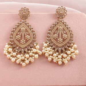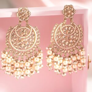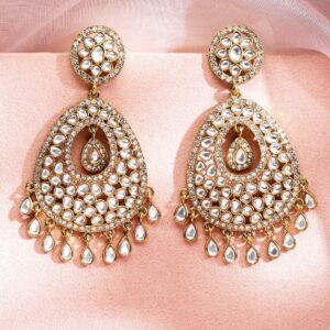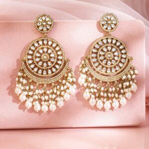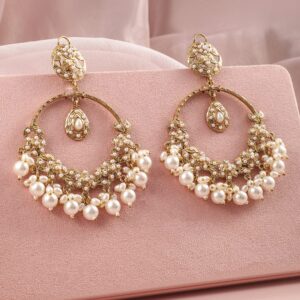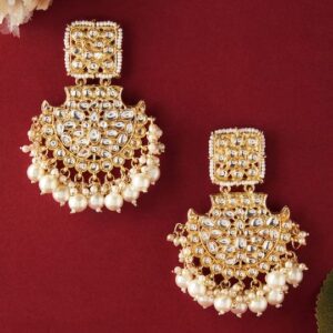 22K Gold-Plated White Kundan Studded Chandbali Earrings with Glossy White Pearl Beads – White