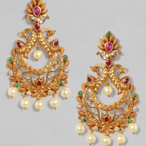 22K Gold Plated Handcrafted Faux Ruby Stone with Pearls Peacock Chandbali Earrings – Gold