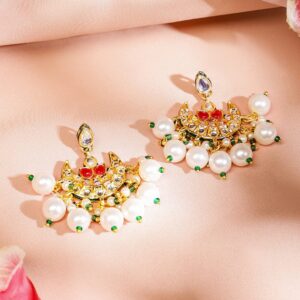 22K Gold-Plated Red Kundan Studded & Green Enamelled White Pearl Beaded Chandbali – Red & White
