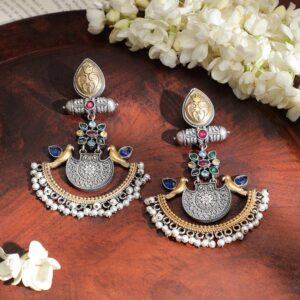 Handcrafted Dual-Tone Oxidised Silver & Gold Plated Bird Motif Chandbali Earrings with Pearl Beaded Drops