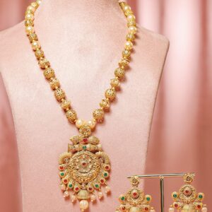 Gold-Plated Orange Stone-Studded Cream Beaded Jewellery Set – Gold