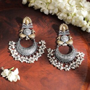 Dual-Toned Oxidized Silver & Gold-Plated Triangle Jhumka Earrings with Silver Ghungroo Beads – Gold