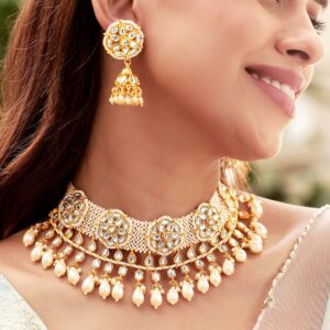 18K Gold-Plated Pearl Beaded Necklace with Kundan Pendant and Golden Drop Detailing