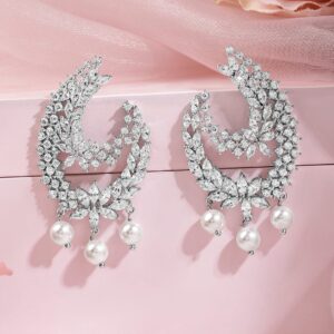 Rhodium-Plated Cubic Zirconia Studded Statement Crescent Earrings with Pearl Drops