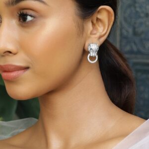 Rhodium-Plated White Cubic Zirconia Studded Statement Jhumka Earrings for Women – Silver