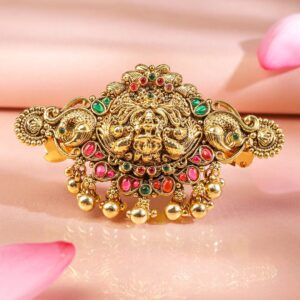 22K Gold-Plated Ruby Pink & Emerald Green Stone Studded Goddess Lakshmi Temple Hair Clip with Hanging Beads
