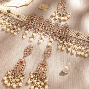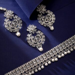 Rhodium Plated Reverse AD & Pearl beaded Choker Set – Silver