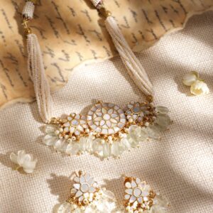 18K Gold-Plated White Kundan Necklace Set with Green Enamel, White Pearls and Peach Beads