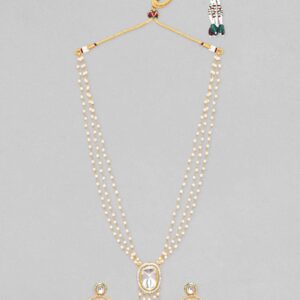 22K Gold-Plated White Kundan-Studded Multi-Strand Pearl Necklace Set with Jhumka Earrings – White