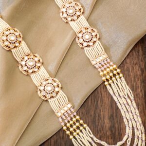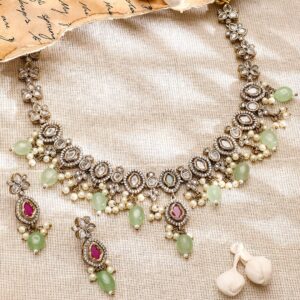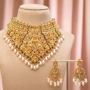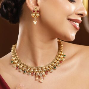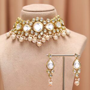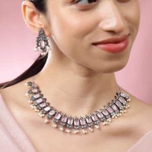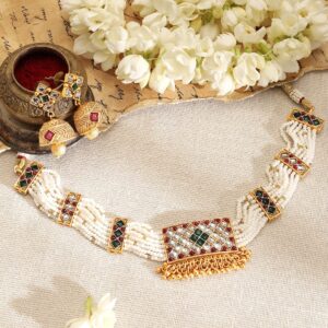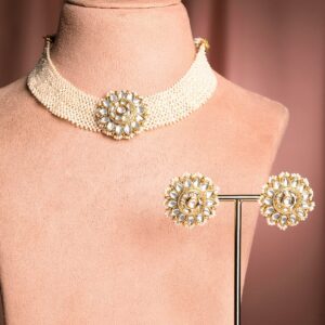 Gold Tone Mirror Studded Pearl beaded Choker Necklace Set – Silver