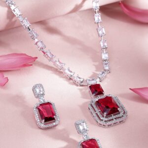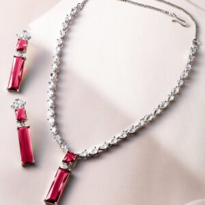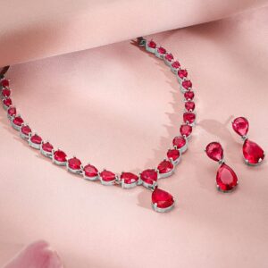 Rhodium-Plated Ruby Red and White Cubic Zirconia Studded Statement Necklace Set – Silver