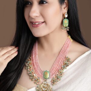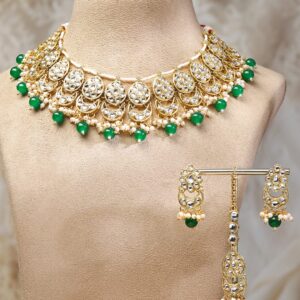 24K Gold Plated Kundan & Green Beaded Handcrafted Layered Necklace Set with Earring – Green