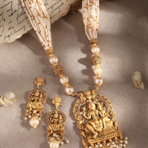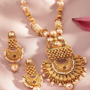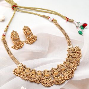22K Gold-Plated Ruby Red Stone Studded Traditional Temple Long Necklace Set for Women – Red