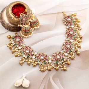 22K Gold-Plated White, Red & Green Stone & Gold Pearl Beaded Handcrafted Jewellery Set – Gold