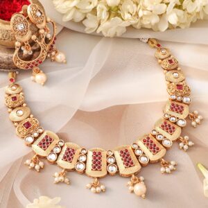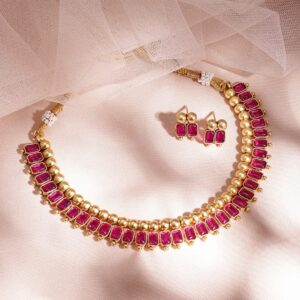 24K Gold Plated Handcrafted Ruby & Cubic Zicronia Studded Choker Jewellery Set – Gold