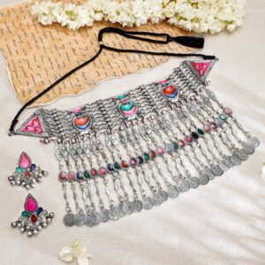 Silver Oxidised Necklace Set With Multicolour Enamel