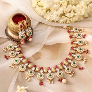 18K Gold-Plated Ruby Pink & Emerald Green Studded Temple Design Necklace Set with Golden Bead Accents for Women
