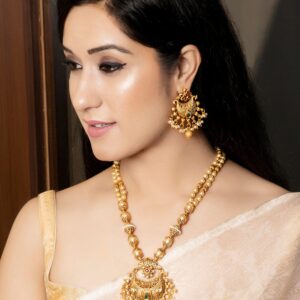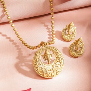Divine 22K Gold Plated Ganesh Motif with Golden Beaded Temple Pendent Jewellery Set – Gold