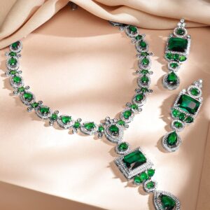 Rhodium-Plated Emerald & CZ Studded Pendant Necklace Set – Green