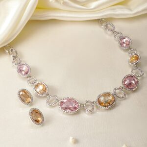 Rhodium Plated Pink & Golden Oval Cubic Zirconia Studded Statement Necklace Set – Silver