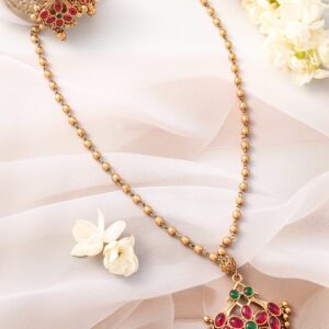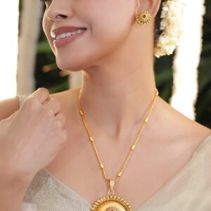 18K Gold-Plated Floral Motif Ethnic Pendant Necklace Set with Ruby Red Center Stone