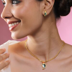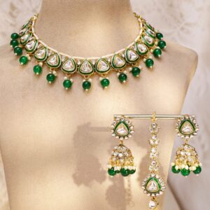 22K Gold-Plated Green Enamel Kundan Studded Necklace Set with Pearl Beaded Drops – Gold
