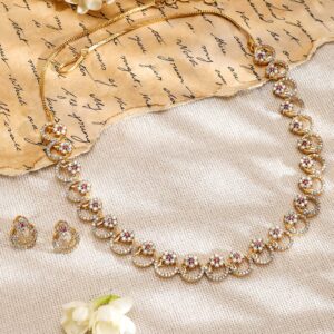22K Gold-Plated Cubic Zirconia & Pink Stone Studded Necklace with Matching Earrings – Gold