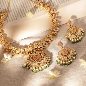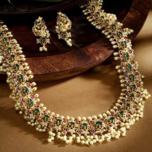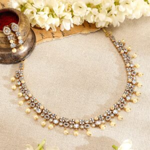 22K Gold Plated Kemp & Zirconia Crystal Studded Pearl Beaded Handcrafted Necklace Set – Gold