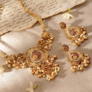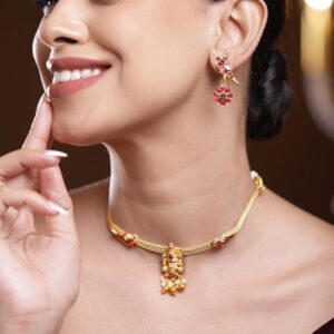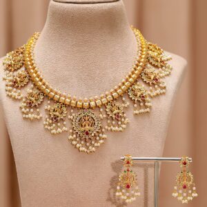 24K Gold-Plated Lakshmi Temple Necklace Set with Ruby Stones & Pearl Detailing – Gold
