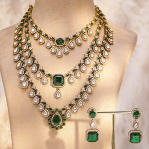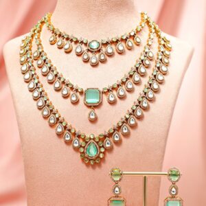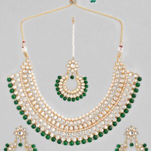 22K Gold Plated White & Green Kundan Studded & Beaded Multilayered Jewellery Set – Dark Green