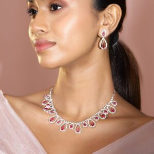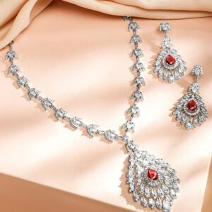 Rhodium-Plated Ruby Red & White Cubic Zirconia Studded Luxe Drop Necklace Set – Red