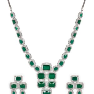 Rhodium Plated Emerald Teardrop Pendant Necklace Set with AD & Cubic Zirconia Studded – Silver