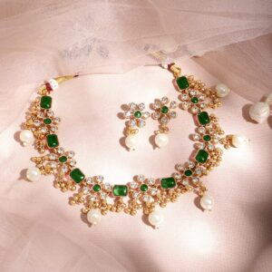 Premium 22K Gold Plated Emerald Green & Cubic Zirconia Studded Necklace Set with Gold & Pearl Beaded – Gold