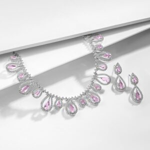 Rhodium-Plated Pastel Pink AD Stone & Cubic Zirconia Studded Choker Necklace Set – Silver