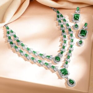 Silver-Plated Emerald Green & AAA Cubic Zirconia Statement Necklace Set with Artistic Wave Design