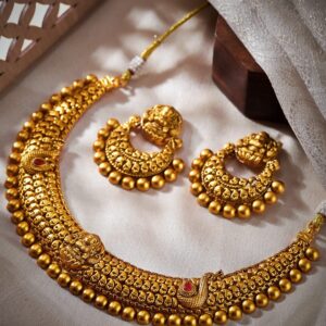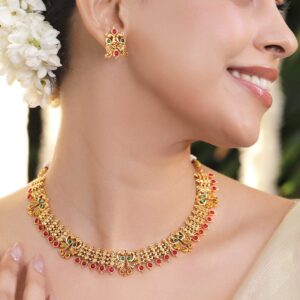 18K Gold-Plated Ruby & Emerald Studded Brass Elephant Motif Temple Necklace Set