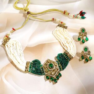 22K Gold-Plated Handcrafted Choker Necklace Set with Emerald Green Cubic Zirconia & Off-White Beads