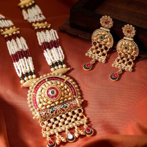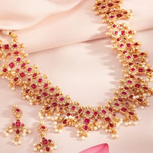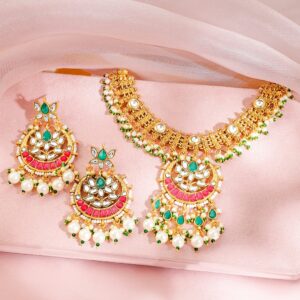 24K Gold-Plated Ruby Red & Emerald Green Kundan Studded Necklace Set with Pearl Drops