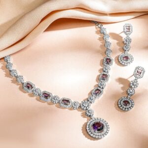 Rhodium-Plated Purple Sapphire & Cubic Zirconia Studded Premium Necklace Set